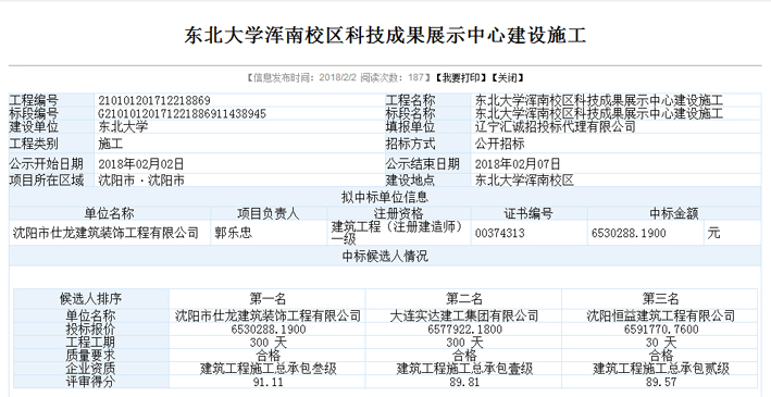 東北大學渾南校區科技成果展示中心建設施工中標公示